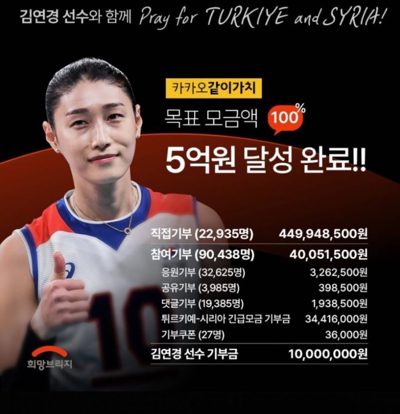 배구 선수 김연경씨도 참혹한 피해를 겪은 튀르키예와 시리아 국민을 위해 사회적 관심을 독려하기 위해 1000만 원 기부 및