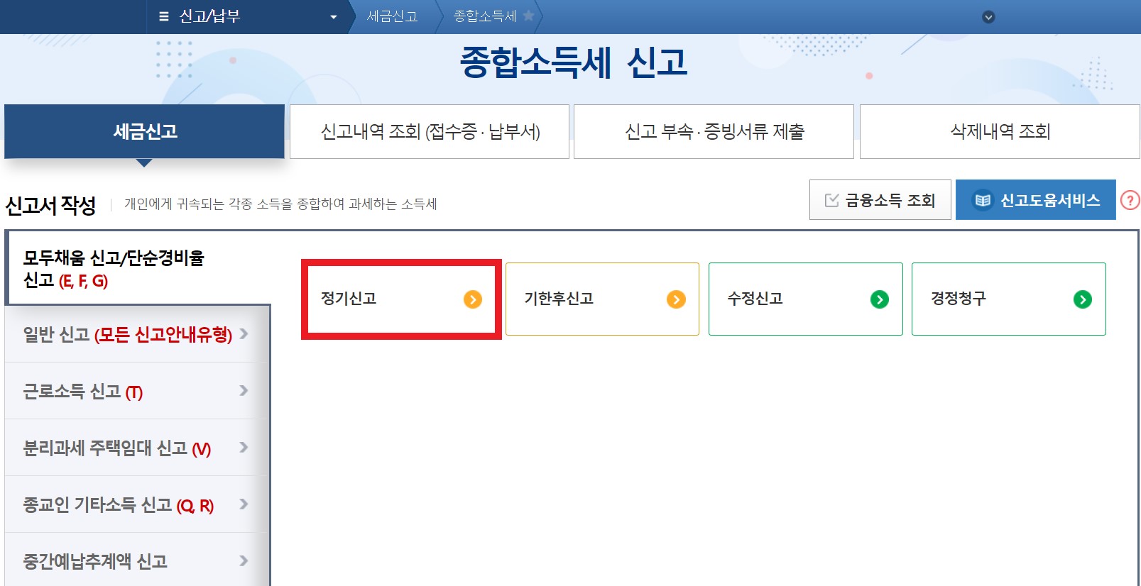 각자 신고 안내문에 적힌 신고 유형을 선택하고 정기 신고를 선택해 주세요.